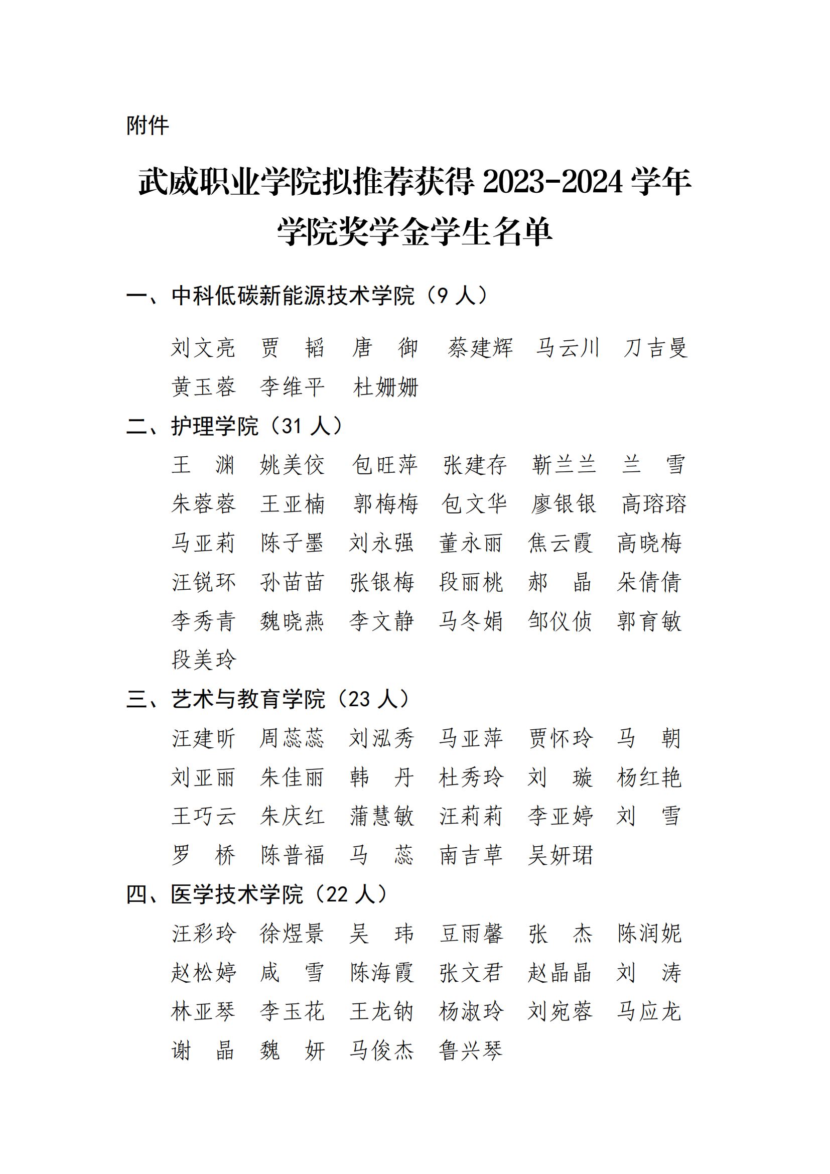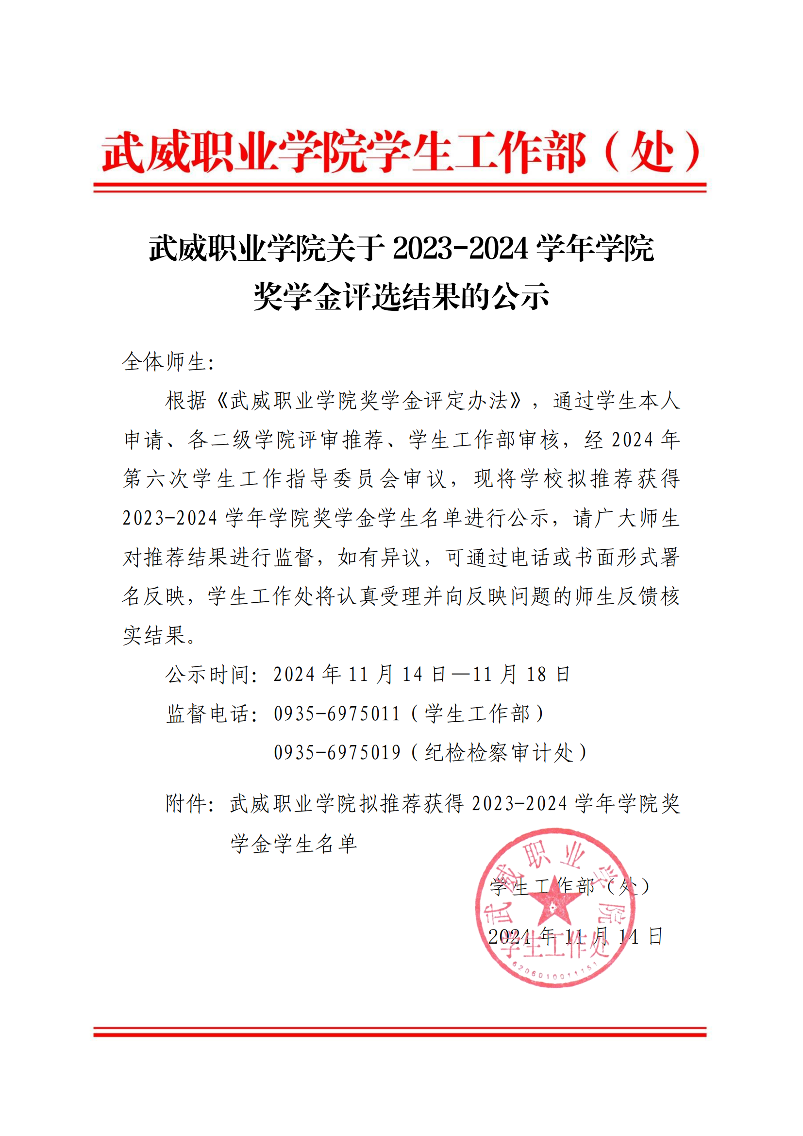 武威職業(yè)學院關于2023-2024學年學院獎學金評選結(jié)果的公示
