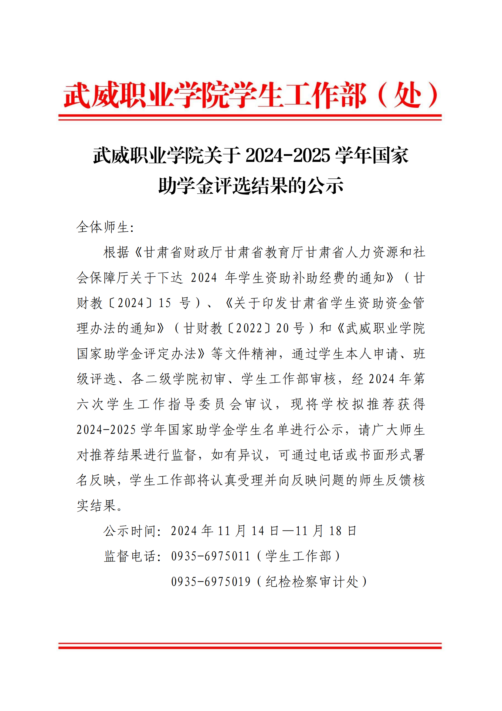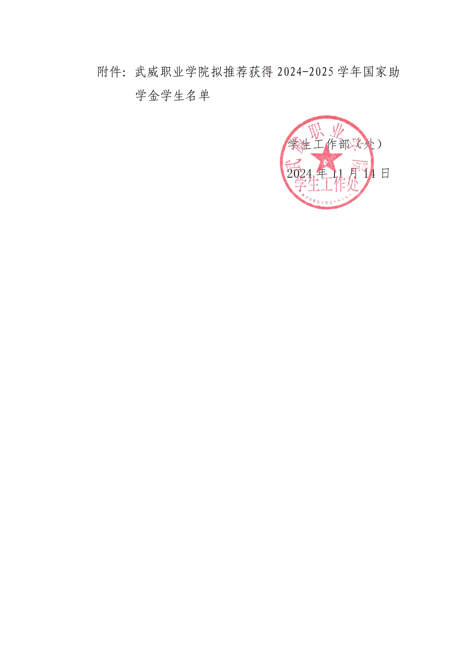 武威職業(yè)學院關于2024-2025學年國家助學金評選結果的公示