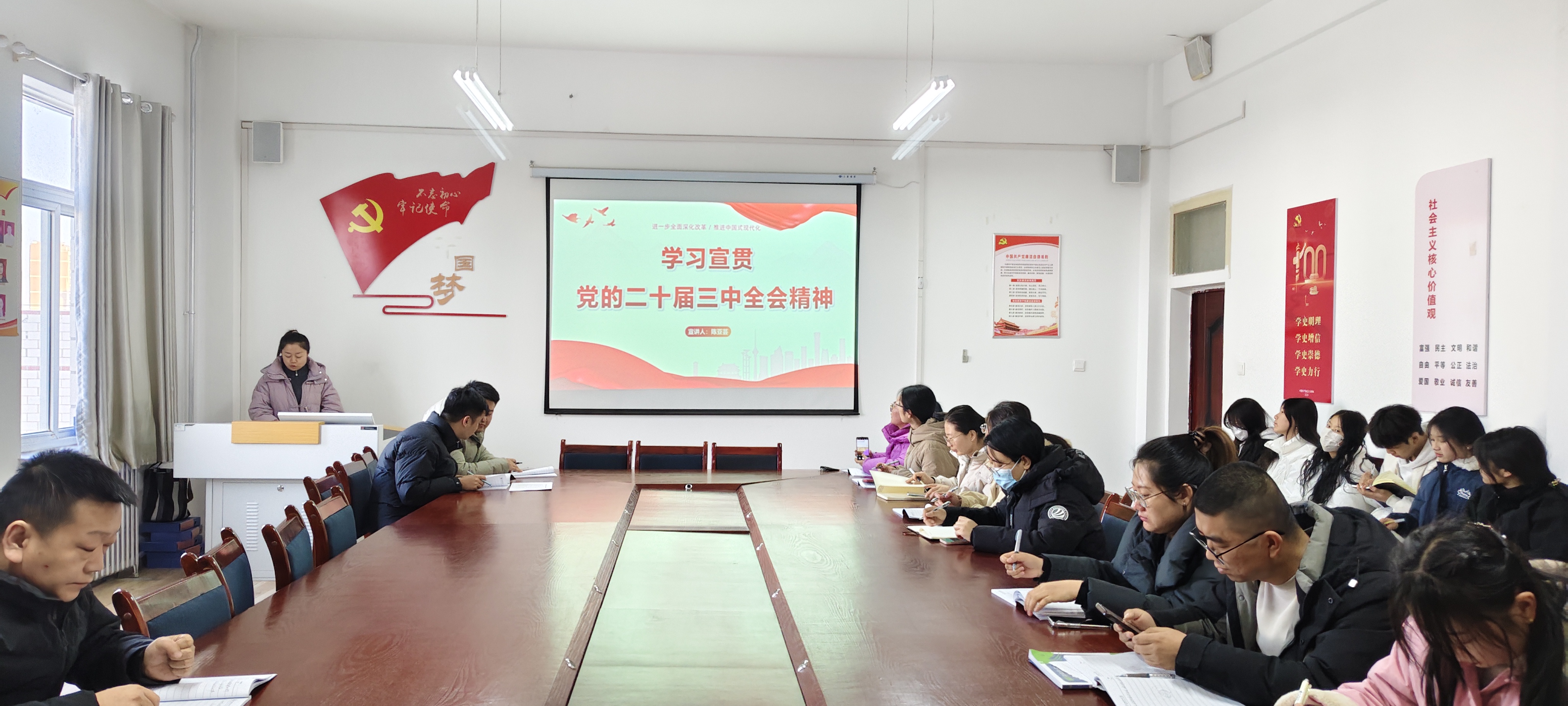 陳亞蕓聚焦黨的二十屆三中全會精神,從深刻認(rèn)識黨的二十屆三中全會的主題和意義,深入學(xué)習(xí)領(lǐng)會習(xí)近平總書記在全會上的重要講話精神,全面準(zhǔn)確理解《中共中央關(guān)于進(jìn)一步全面深化改革、推進(jìn)中國式現(xiàn)代化的決定》提出的進(jìn)一步全面深化改革重大舉措,全力以赴貫徹落實(shí)全會精神、凝心聚力推進(jìn)職業(yè)教育高質(zhì)量發(fā)展四個方面詳細(xì)闡述,通過全面、深入、系統(tǒng)的宣講,進(jìn)一步深化與會黨員對全會精神的理解,為推動藥學(xué)院高質(zhì)量發(fā)展提供實(shí)踐指導(dǎo)。