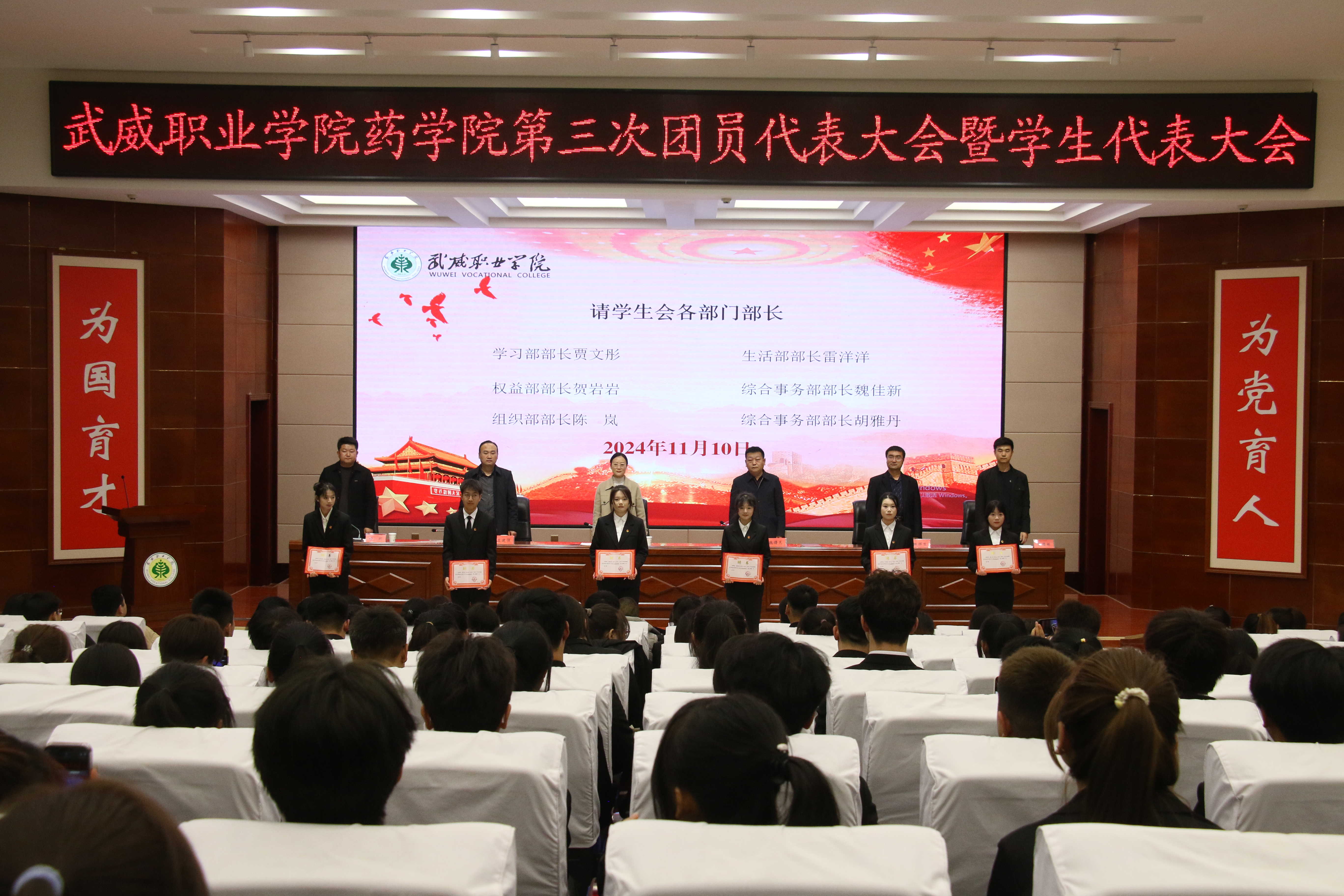 魏曙光宣讀了第三屆團(tuán)委委員名單和學(xué)生會(huì)主席團(tuán)成員名單。參會(huì)老師為新一屆團(tuán)委委員和學(xué)生會(huì)主席團(tuán)成員頒發(fā)了聘書(shū)。