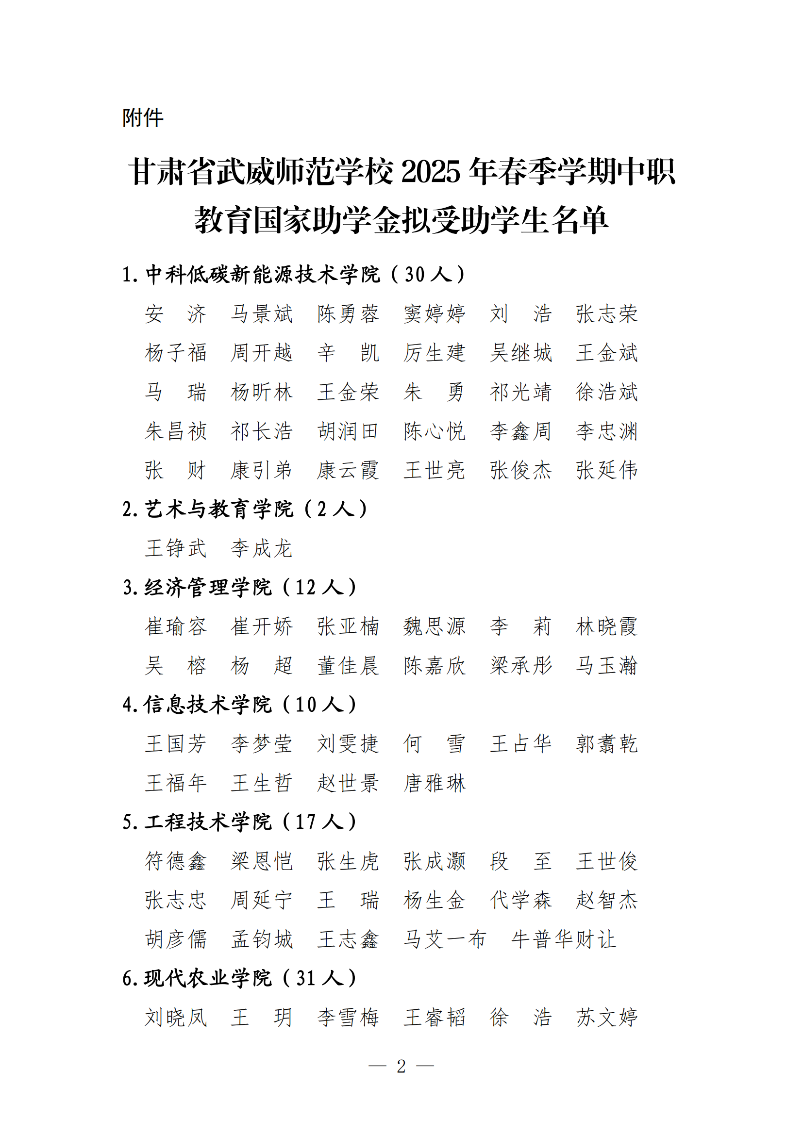 2025年春季學期甘肅省武威師范學校國家助學金公示