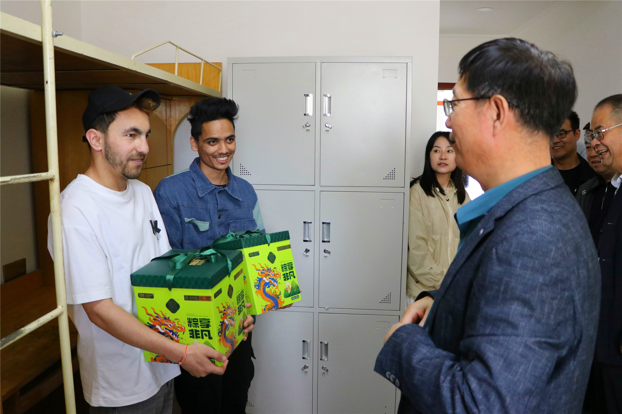端午將至,為更好開展留學(xué)生教育管理工作,使我校來(lái)華留學(xué)生更好地認(rèn)識(shí)和體驗(yàn)中國(guó)傳統(tǒng)節(jié)日文化,5月30日,學(xué)校黨委副書記、副校長(zhǎng)張開禮,黨委副書記翟存祥,黨委委員、副校長(zhǎng)王守云一行與國(guó)際合作交流處全體工作人員走進(jìn)留學(xué)生公寓,給留學(xué)生們送去節(jié)日的關(guān)懷和溫暖。