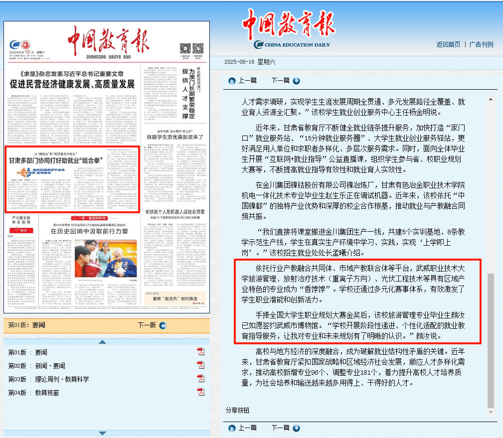 8月16日,《中國教育報》要聞版刊發(fā)“從‘促就業(yè)’到‘高質(zhì)量充分就業(yè)’甘肅多部門協(xié)同打好助就業(yè)‘組合拳’”的專題報道,報道了我校深化產(chǎn)教融合,賦能高質(zhì)量充分就業(yè)的創(chuàng)新實踐案例。