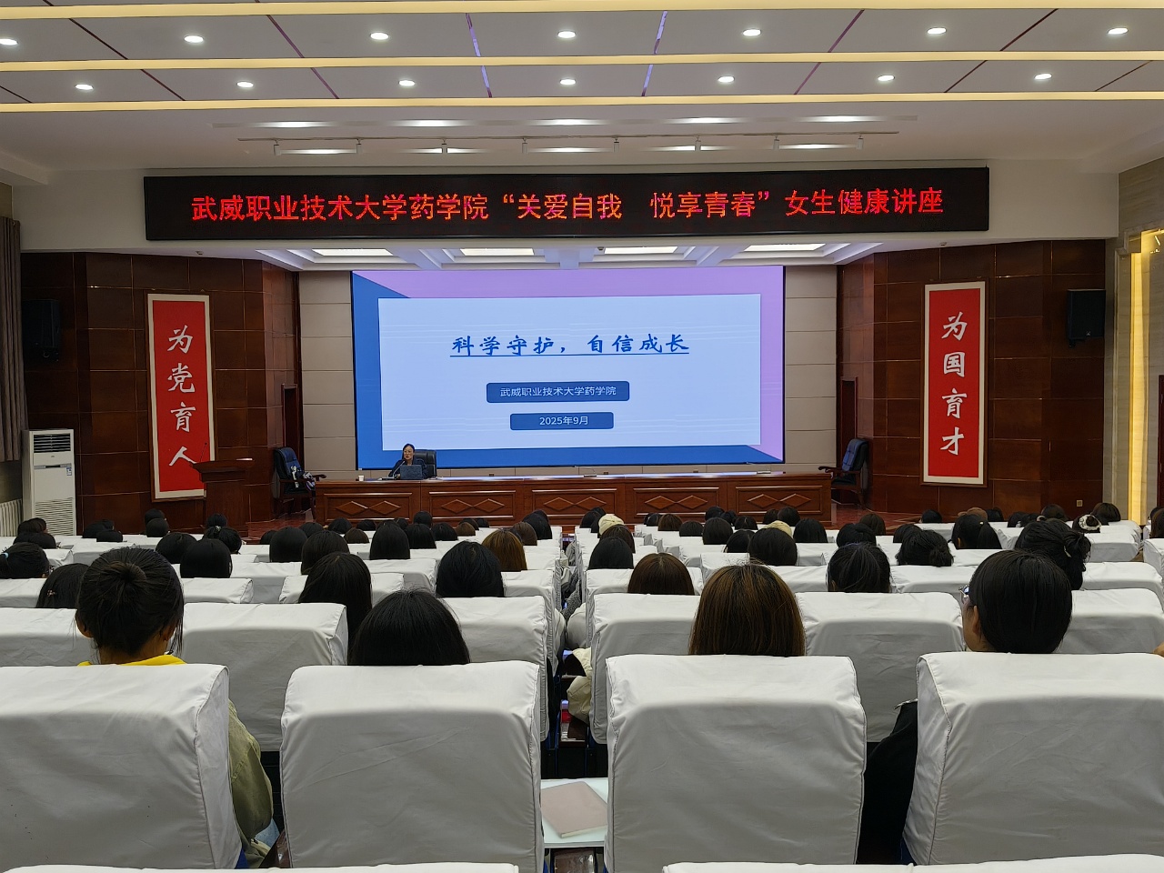 為幫助我院女生適應(yīng)青春期身心變化,掌握心理調(diào)適技巧,普及健康知識(shí),9月22日,藥學(xué)院副院長(zhǎng)馬琪在菁英廳開(kāi)展了“關(guān)愛(ài)自我、悅享青春”女生健康主題講座,藥學(xué)院360名女生分2批聆聽(tīng)了本次講座。