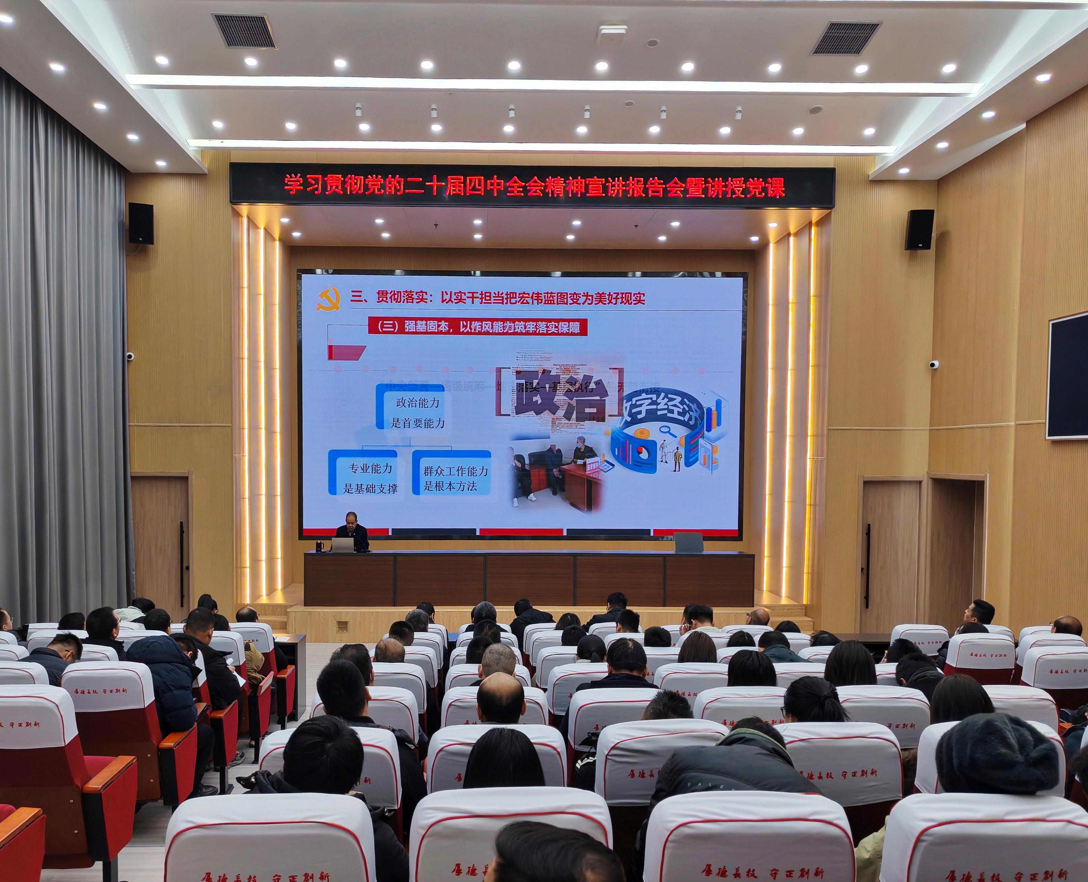 12月11日,學(xué)校宣講組成員、黨委副書記翟存祥在能源科技樓1樓報(bào)告廳作專題宣講報(bào)告,學(xué)院全體黨員及入黨積極分子聆聽學(xué)習(xí)。翟存祥從全會重大意義、核心要義、實(shí)踐要求三個(gè)維度,對黨的二十屆四中全會精神進(jìn)行了全面深入的解讀。他寄語師生,要將個(gè)人理想追求與國家發(fā)展大局緊密相連,主動(dòng)對標(biāo)“十五五”規(guī)劃部署,傳承發(fā)揚(yáng)艱苦奮斗、銳意進(jìn)取的優(yōu)良作風(fēng),以實(shí)際行動(dòng)助力學(xué)校教育教學(xué)高質(zhì)量發(fā)展,為推進(jìn)中國式現(xiàn)代化建設(shè)貢獻(xiàn)力量。