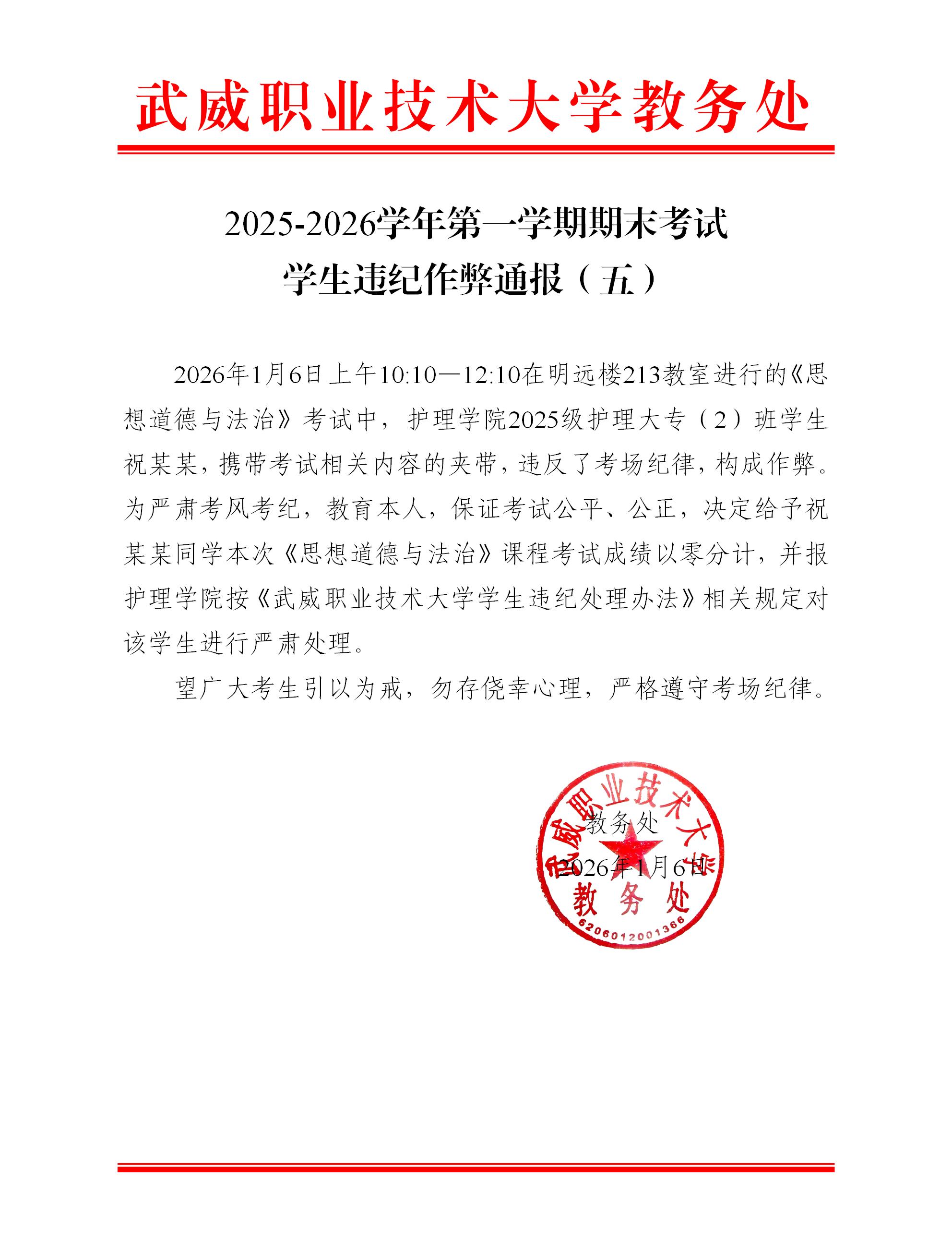 2025-2026學(xué)年第一學(xué)期期末考試學(xué)生違紀(jì)作弊通報(五)