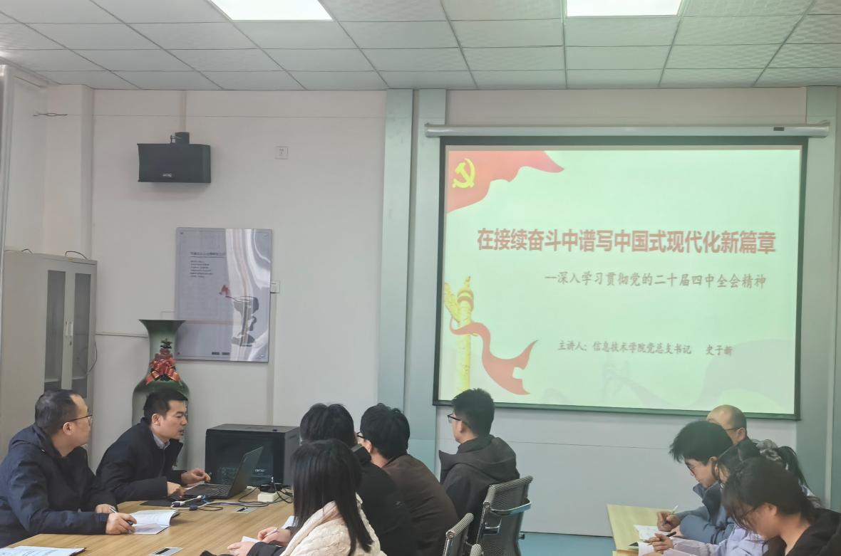 為深入學(xué)習(xí)貫徹黨的二十屆四中全會(huì)精神,引導(dǎo)學(xué)院教師深刻把握其重大意義與核心要義,凝聚奮進(jìn)力量,近日,信息技術(shù)學(xué)院黨總支書(shū)記為全體教師講授了題為“在接續(xù)奮斗中譜寫(xiě)中國(guó)式現(xiàn)代化新篇章”的專題黨課。