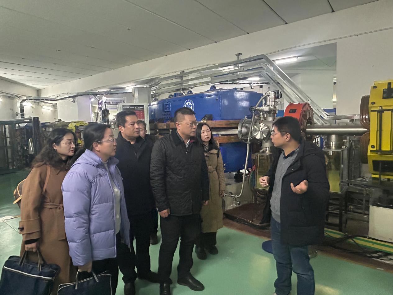 隨后,在醫(yī)用探測器室主任毛瑞士與副主任徐治國的陪同下,調(diào)研組實(shí)地參觀了“國之重器”——蘭州重離子加速器裝置,詳細(xì)了解了其結(jié)構(gòu)組成、運(yùn)行機(jī)制與核心技術(shù)原理。毛瑞士結(jié)合該裝置在重離子醫(yī)用探測器研發(fā)、醫(yī)用束測控制等領(lǐng)域的實(shí)際應(yīng)用,闡釋了核探測技術(shù)對提升醫(yī)學(xué)診療精度的支撐作用,使調(diào)研組成員切身感受到大科學(xué)裝置的科技魅力與實(shí)用價(jià)值。