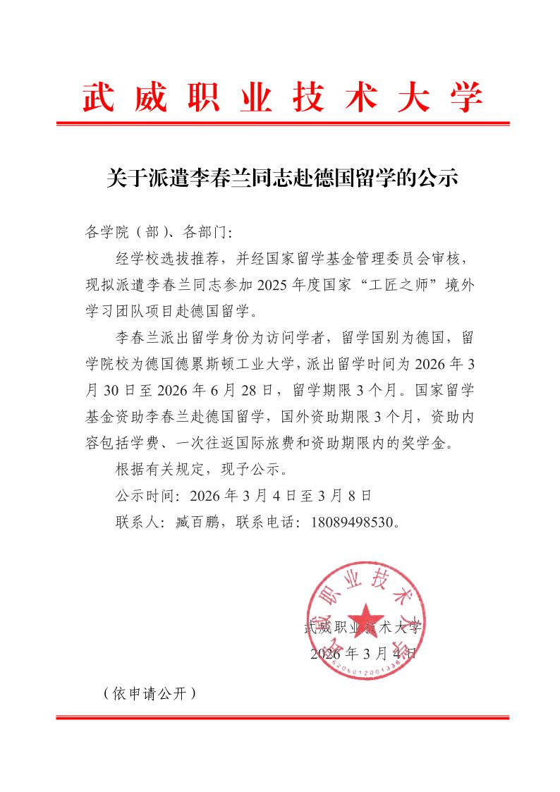 關(guān)于派遣李春蘭同志赴德國(guó)留學(xué)的公示