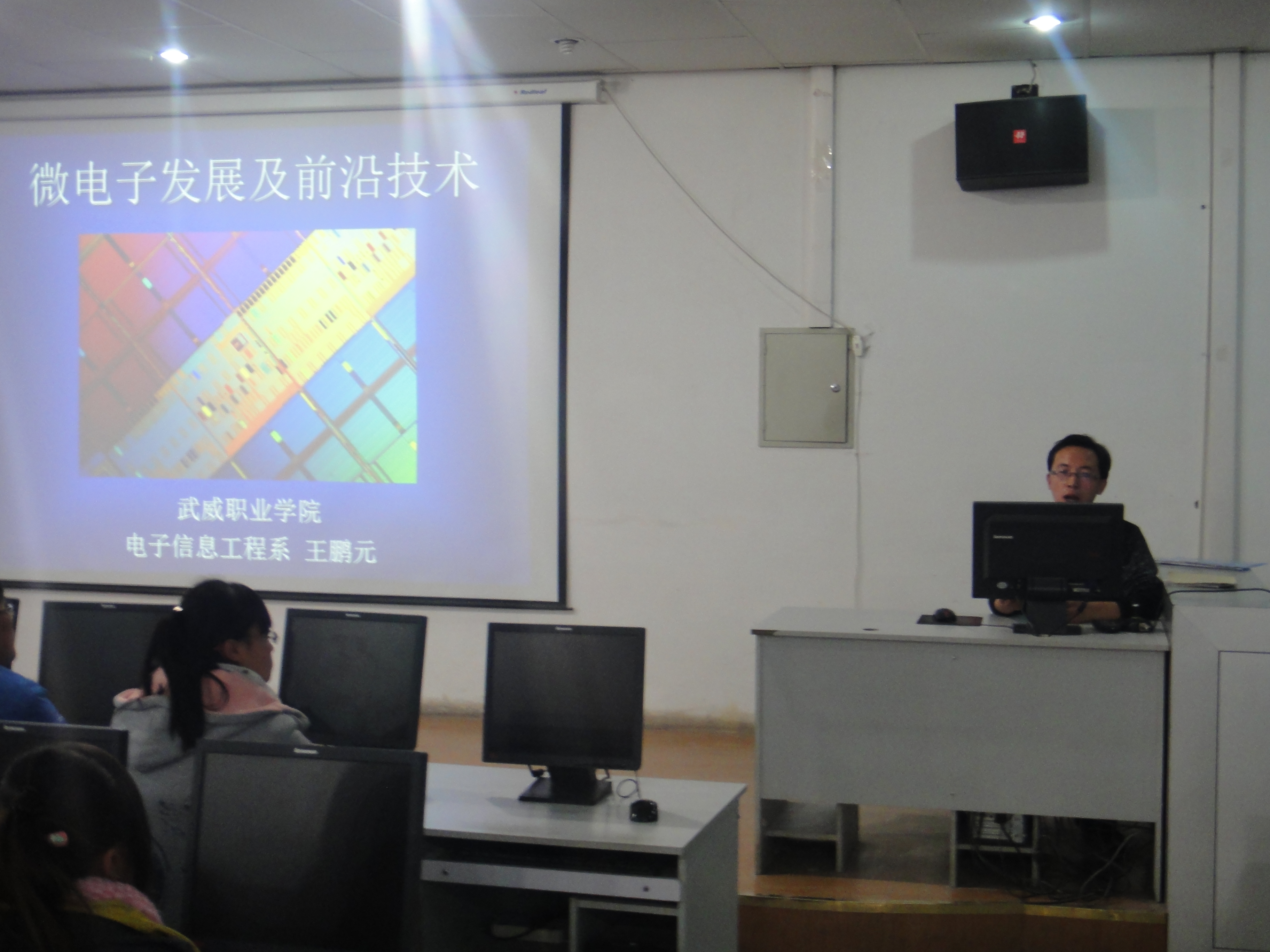 王老師以世界電子發(fā)展歷史為背景,先后講解了微電子發(fā)展及前沿技術(shù)、集成電路應(yīng)用60年、晶體管的發(fā)明、世界上第一臺計算機的誕生及發(fā)展、多核微處理器、微電子技術(shù)的主要發(fā)展方向、集成電路制造工藝、新器件與新材料、集成電路走向系統(tǒng)芯片、集成電路的發(fā)展史、MEMS技術(shù)和生物信息技術(shù)將成為下一代半導(dǎo)體主流技術(shù)等內(nèi)容;之后又結(jié)合自身經(jīng)歷在不斷地發(fā)問中引導(dǎo)同學(xué)們思考,簡單介紹了電源電路、基本元器件的識別,示波器等測量儀器的使用。