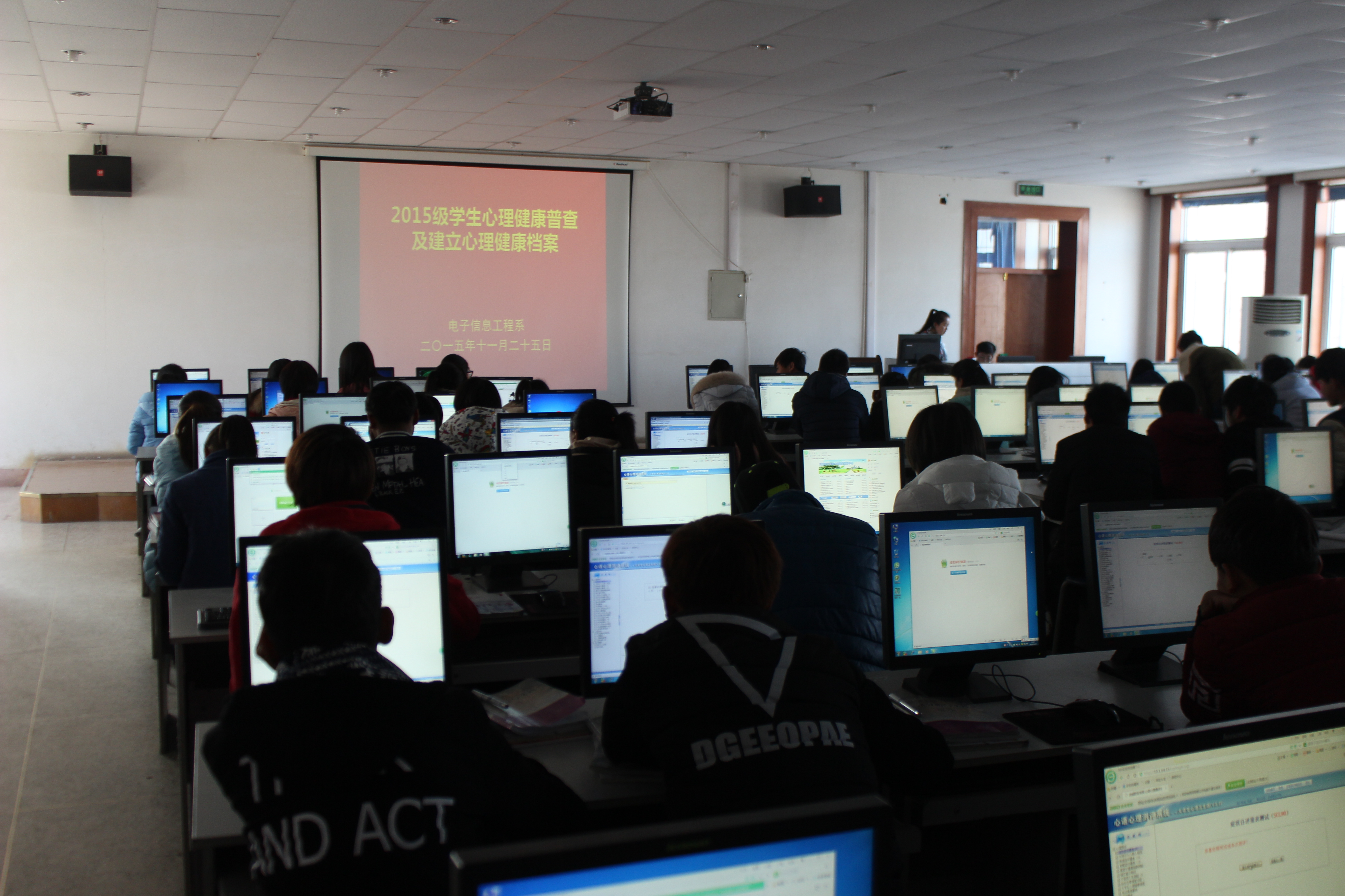 為及時(shí)掌握2015級(jí)學(xué)生的心理健康狀況,有針對(duì)性地進(jìn)行心理健康教育,按照學(xué)院心理健康普查安排及要求,11月25日12時(shí)10分,電子信息工程系組織2015級(jí)學(xué)生226人在尚德樓十號(hào)機(jī)房完成了心理健康狀況普測(cè)工作,并為每個(gè)同學(xué)建立了心理健康檔案。