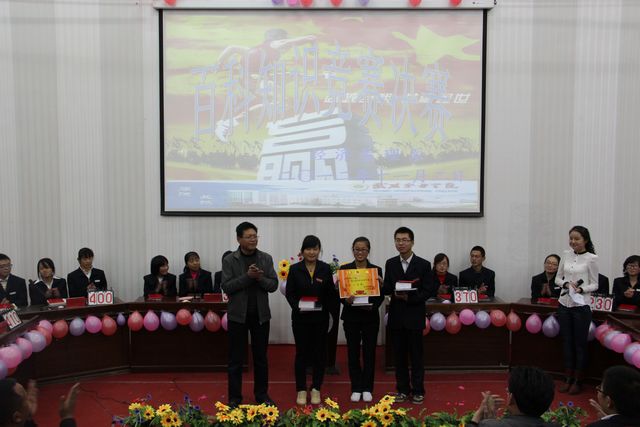 競賽結束后,王院長揭曉了本次比賽的全部獎項,并對比賽中各代表隊的不俗表現(xiàn)給予了高度評價。他認為經濟管理系本次“百科知識競賽”集知識性與趣味性于一體,既豐富了學生的課余生活又拓寬了學生的知識面,在大學校園中非常必要,以后要多舉辦類似的活動。隨后,經管系黨總支白書記作了總結講話,白書記首先對本次競賽取得圓滿成功表示祝賀,向在百忙之中抽出時間來參加活動的領導及老師表示衷心的感謝,并對本次組委會師生付出地辛勤勞動予以肯定!白書記希望,全體同學能以此次知識競賽活動為契機,勤奮學習、苦練技能,奮力拼搏,成為優(yōu)秀的應用性人才。