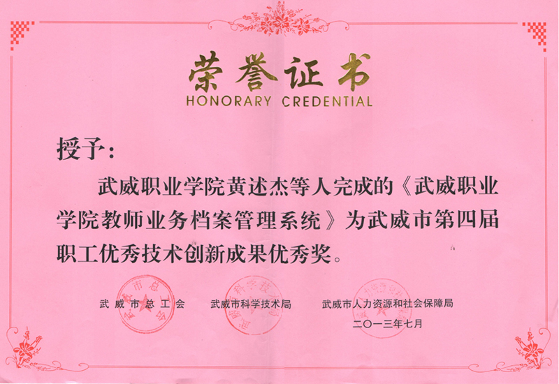 武威市第四屆職工優(yōu)秀技術(shù)創(chuàng)新成果優(yōu)秀獎
