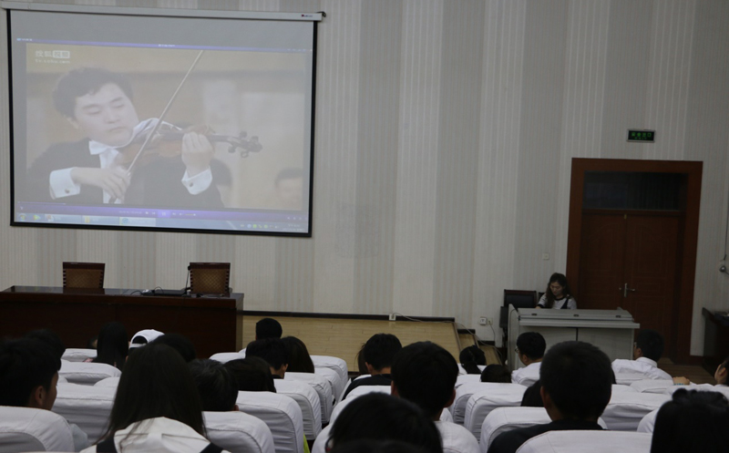 伴著優(yōu)美的音樂旋律王敏副教授開始了講座,王老師首先介紹了音樂發(fā)展歷史和音樂鑒賞的基礎(chǔ)知識,然后以我國著名作曲家陳鋼、何占豪先生創(chuàng)作的小提琴協(xié)奏曲《梁山伯與祝英臺》為題材,分階段講述了“鳥語花香”、“草橋結(jié)拜”、“英臺抗婚”、“投墳化蝶”等內(nèi)容和藝術(shù)場景。剖析了作品在管樂、和以小提琴、大提琴為主的弦樂及民樂有機(jī)結(jié)合的高超藝術(shù)境界,講座過程中王老師結(jié)合《梁祝》協(xié)奏曲音視頻資料,演繹了梁山伯與祝英臺凄美的愛情故事。