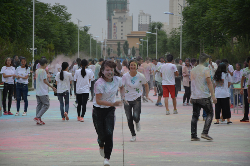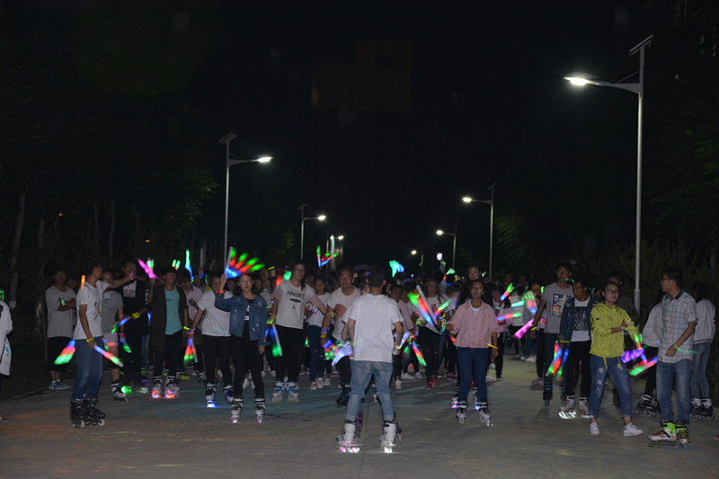 下午三點(diǎn),學(xué)院團(tuán)委宋文龍老師在啟動儀式上做了熱情洋溢的致辭,團(tuán)學(xué)干部帶領(lǐng)參賽選手開啟了本次活動的奔跑。本次活動由“趣味沖關(guān)”“彩虹跑”“熒光夜跑”三個(gè)環(huán)節(jié)組成。“趣味沖關(guān)”由一系列小游戲組成,需要大家齊心協(xié)力、互相配合完成,同學(xué)們滿懷激情,在奔跑的同時(shí)體驗(yàn)著合作的趣味與快樂。掌聲、笑聲、加油聲此起彼伏,選手與觀眾互動交流,整個(gè)過程充滿了愉悅的氣氛。下午五點(diǎn)開啟了整個(gè)活動中最精彩的“彩虹跑”,同學(xué)們手捧玉米粉在慢跑中相互揮灑,多彩的玉米粉在他們身上留下了青春的印記。隨著夜幕降臨,精彩的“熒光夜跑”活動隨之開始,同學(xué)們手帶熒光環(huán),舞動熒光棒,在輪滑社成員的帶領(lǐng)下繞著校園跑動。熒光點(diǎn)綴著夜色,歡快的音樂、青春的聲音充斥著整個(gè)校園?;顒咏Y(jié)束后,在學(xué)院東門小廣場舉行了自由晚會,同學(xué)們圍成一圈,在主持人的帶動下做互動小游戲、自由演唱,一陣陣歡聲笑語回蕩在整個(gè)校園。