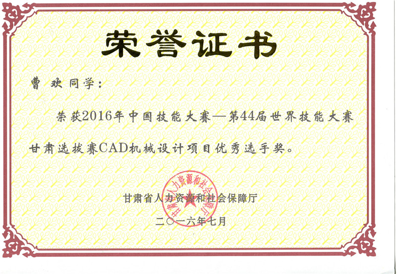 2016年中國技能大賽甘肅選拔賽CAD機(jī)械設(shè)計(jì)項(xiàng)目優(yōu)秀獎(jiǎng)