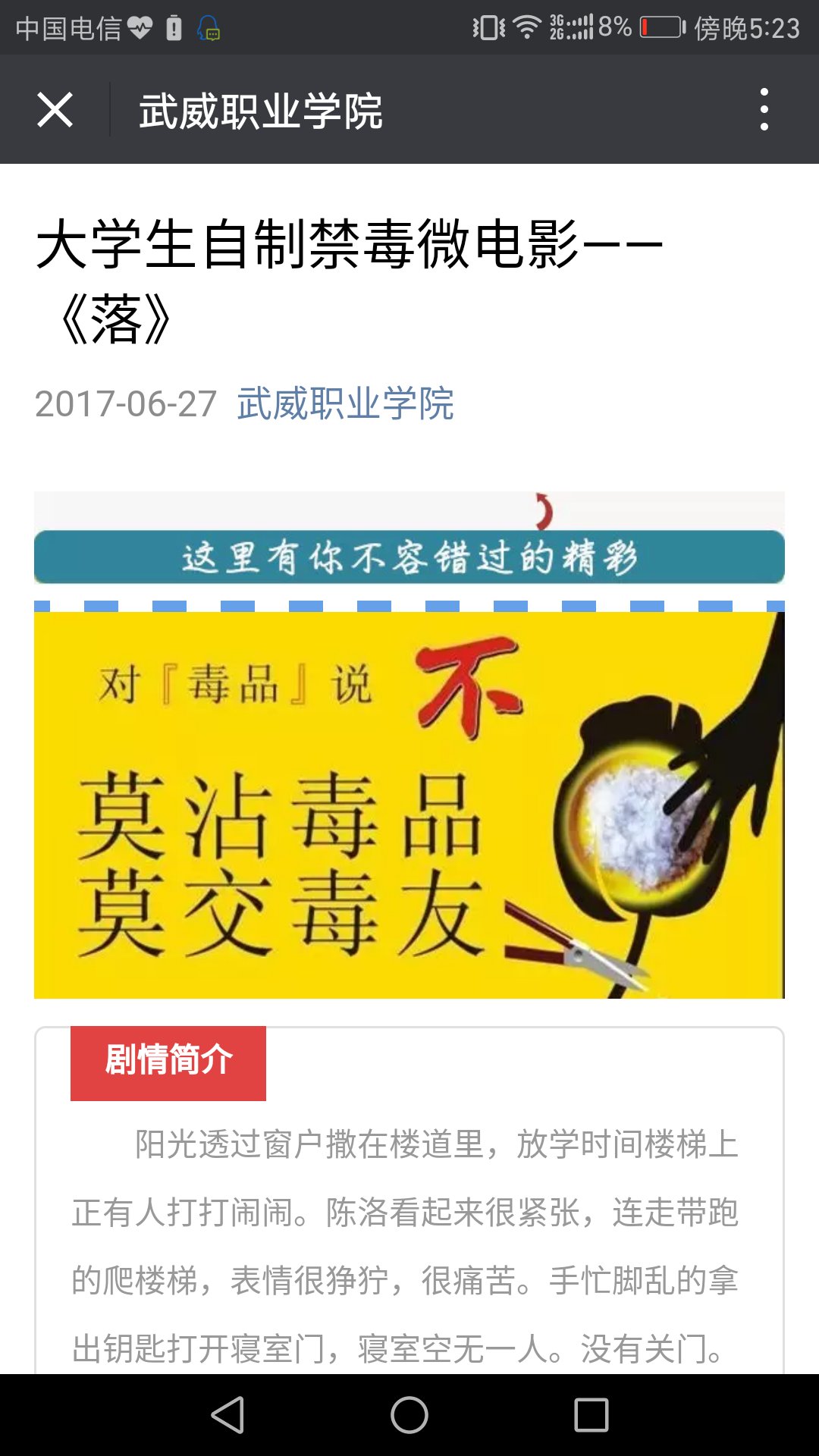 宣傳周期間,利用校園廣播、宣傳欄、新媒體等多種載體以及懸掛宣傳標(biāo)語(yǔ)、召開(kāi)“無(wú)毒青春,健康生活”主題班會(huì)、觀(guān)看禁毒影片等多種形式,向廣大師生講述了新型毒品的種類(lèi)、毒品對(duì)個(gè)人、對(duì)家庭、對(duì)社會(huì)的危害以及作為當(dāng)代大學(xué)生應(yīng)如何樹(shù)立正確的人生觀(guān)和價(jià)值觀(guān),潔身自好,抵制誘惑,避免誤入歧途等常識(shí)。
